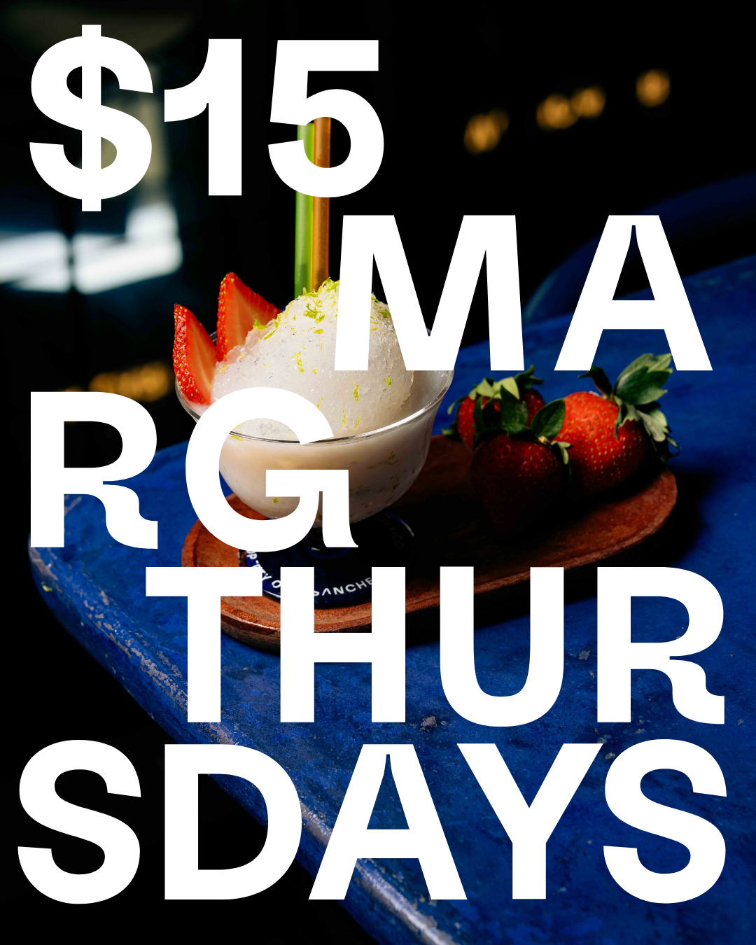 $15 rotating special shaved ice Margaritas, all night long.